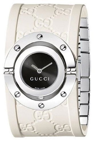 Stainless steel case with a white GG rubber and stainless steel bracelet. Black sun brushed rotating dial with luminous hands. No markerss. The Gucci name appears above the 6 o'clock position. Quartz movement. Scratch resistant sapphire crystal. Case diameter: 33 mm. Case thickness: 6 mm. Jewelry clGucci Twirl Collection Ladies White GG Rubber Watch YA112422 Do not Miss!! Stainless steel case with a white GG rubber and stainless steel bracelet. Black sun brushed rotating dial with luminous hands. No markerss. The Gucci name appears above the 6 o'clock position. Quartz movement. Scratch resistant sapphire crystal. Case diameter: 33 mm. Case thickness: 6 mm. Jewelry cl... Gucci Twirl Collection Ladies White GG Rubber Watch YA112422